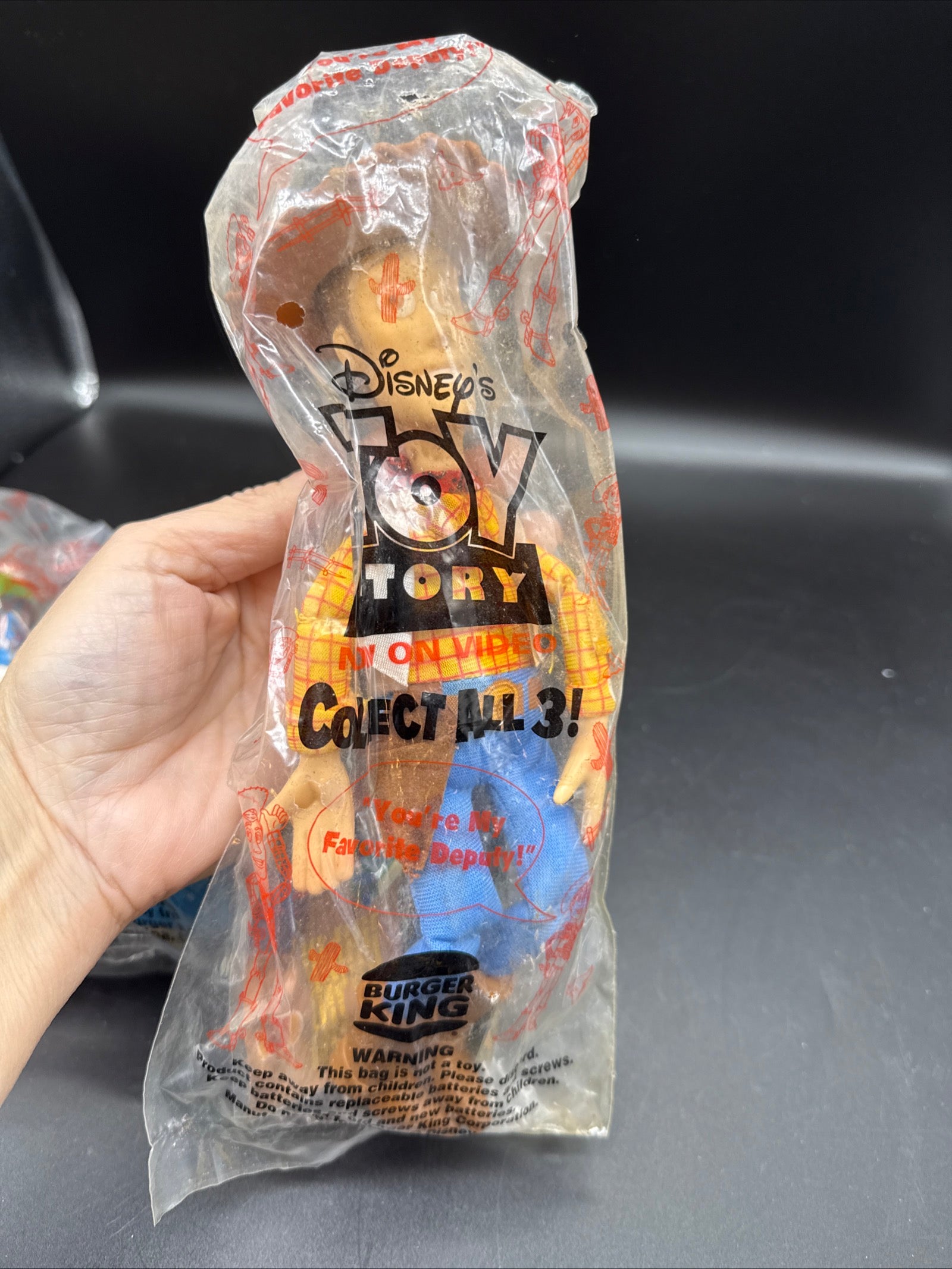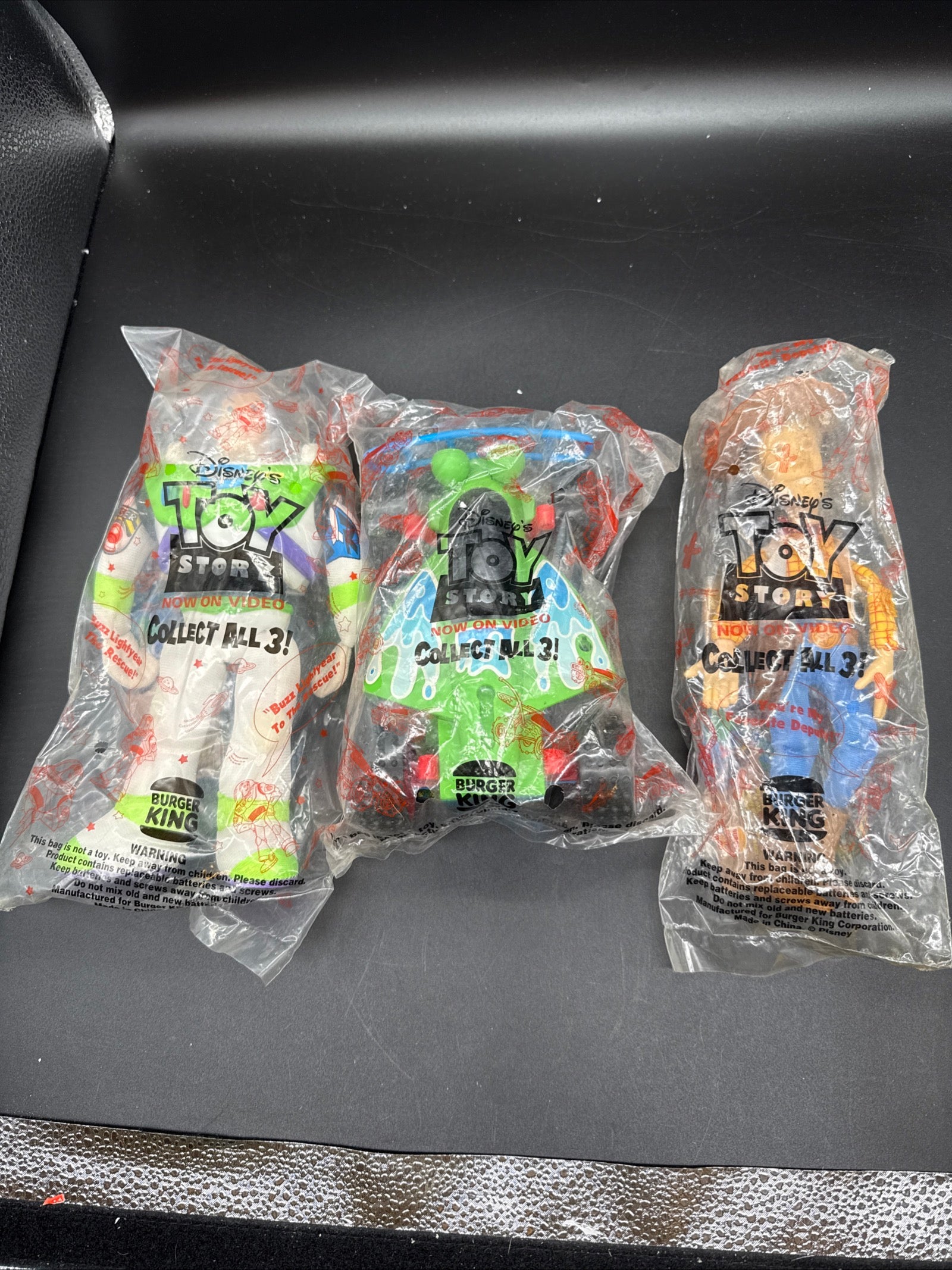 The image shows a set of three 1995 Burger King "Toy Story" promotional toys, still sealed in their original packaging. These were released in conjunction with the first "Toy Story" movie. The set includes: