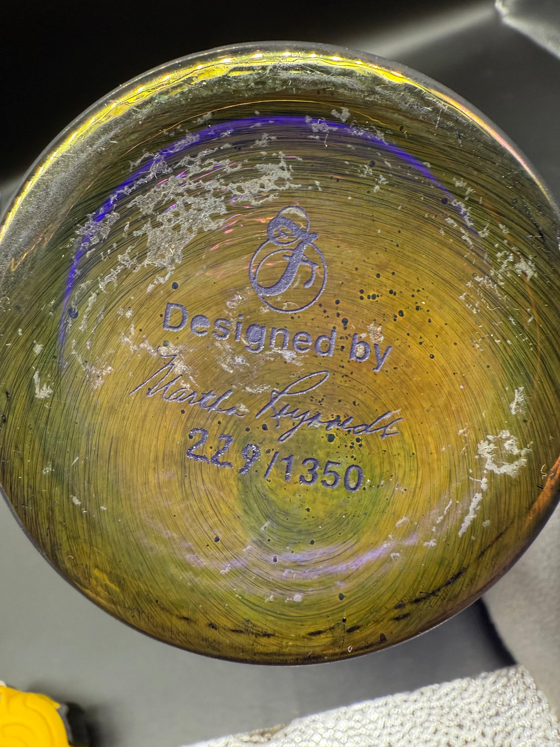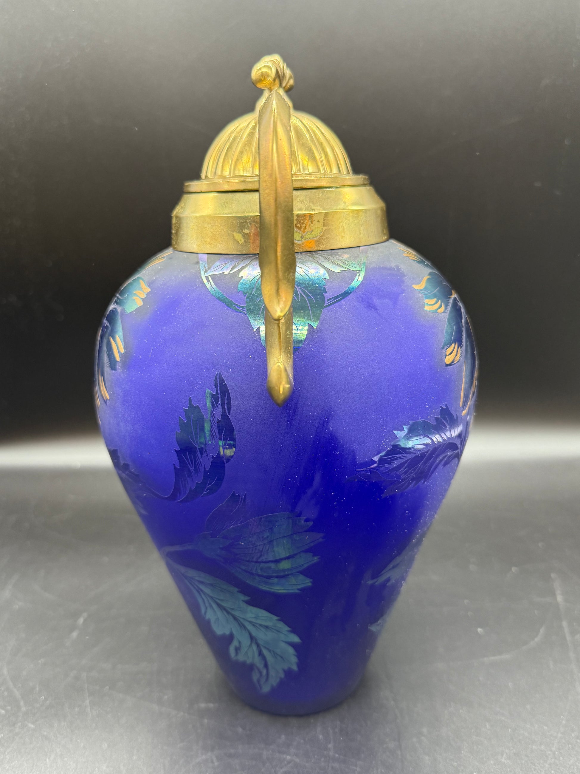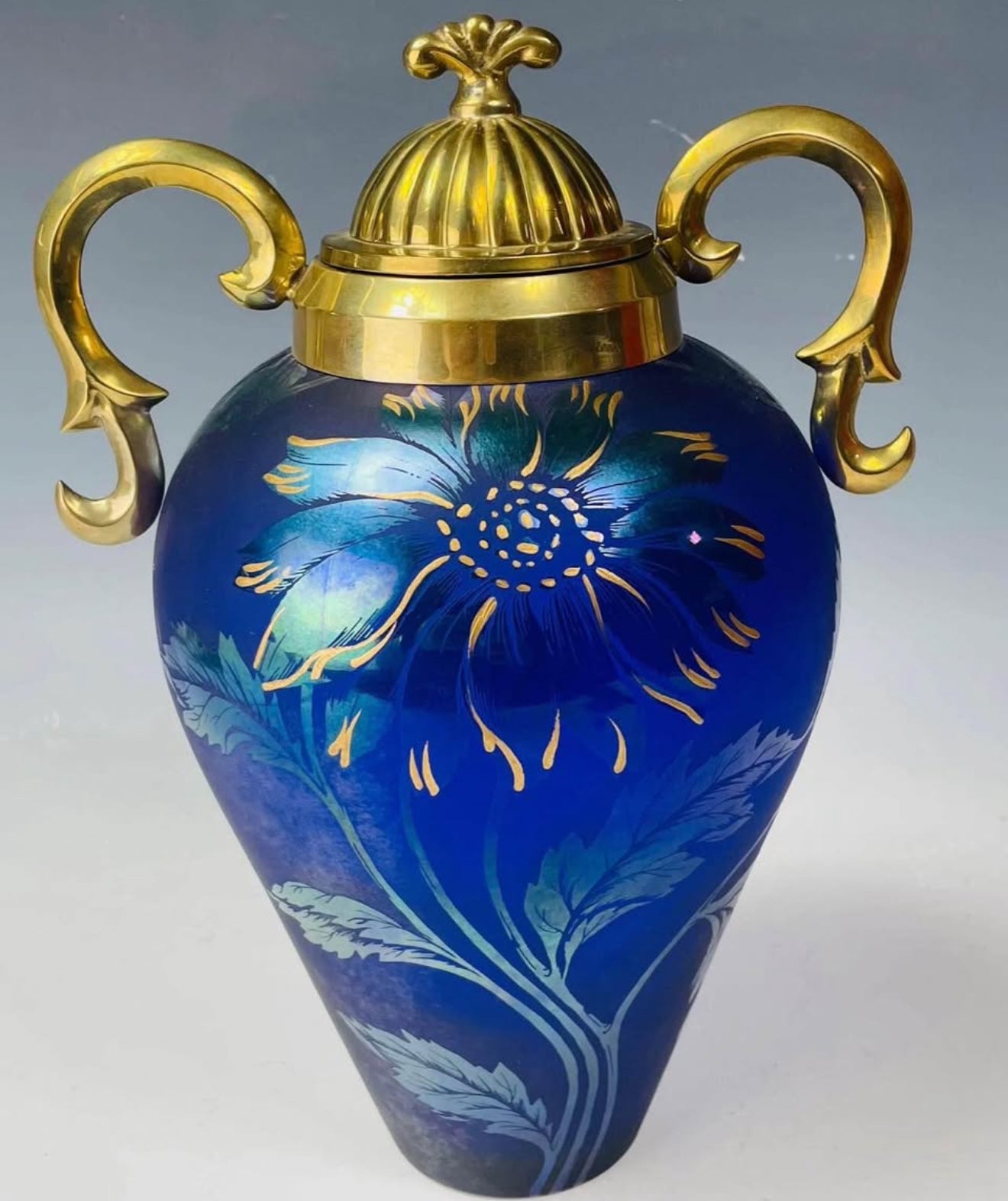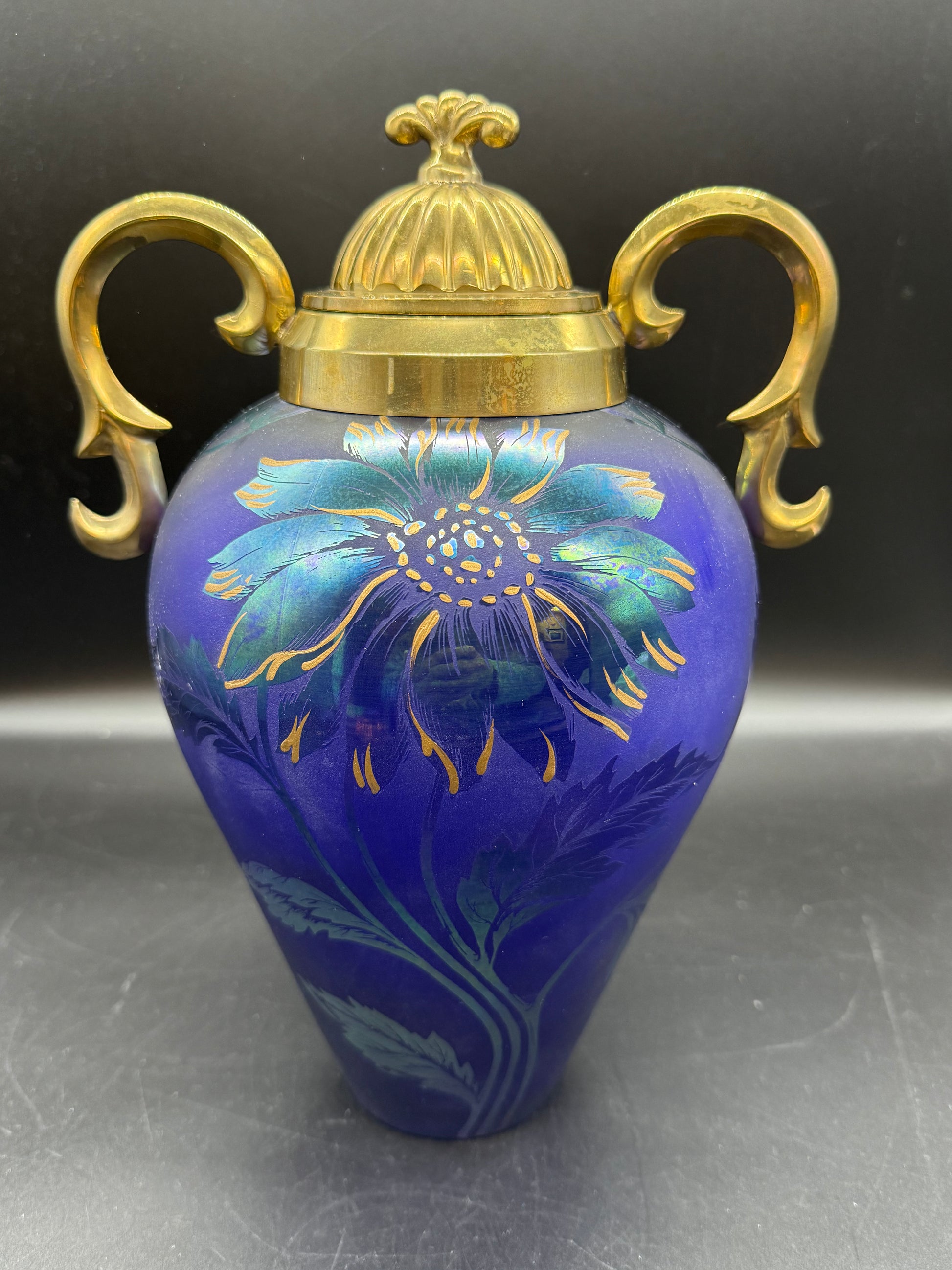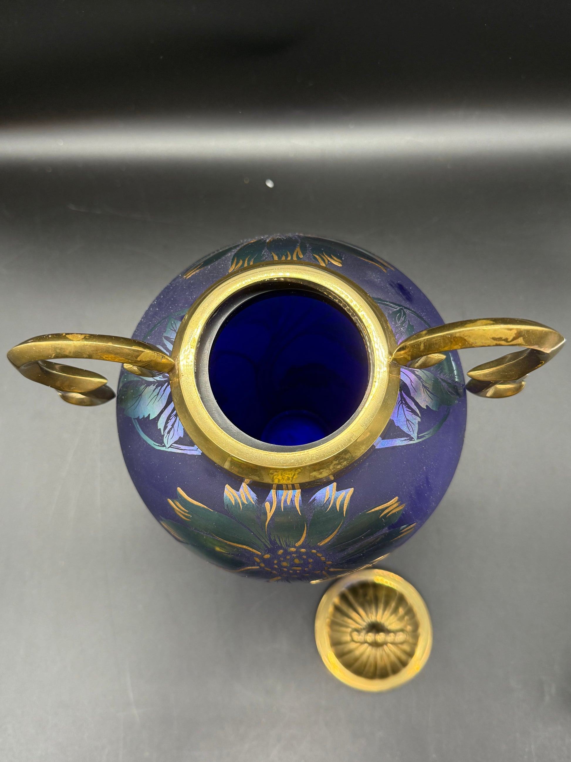Beautiful Art glass and gilt metal mounted covered urn vase by Martha Reynolds ~ decoration designer at Fenton Art Glass who retired in 2001.