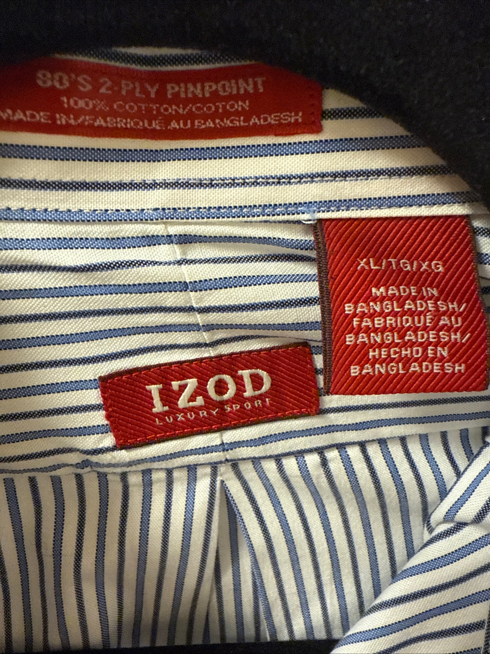 Crafted from 100% cotton knit fabric, this shirt is comfortable and easy to care for. Its regular fit and XL size make it a great addition to any outfit. The IZOD logo and button accents give it a touch of class. This dress shirt is perfect for the winter, fall, and spring seasons, and it has been made in Bangladesh.