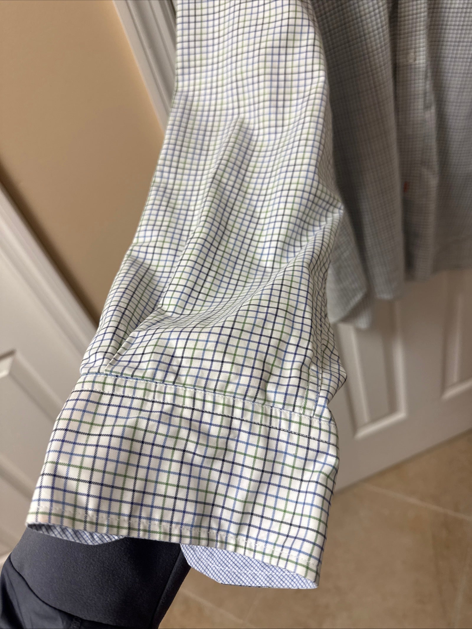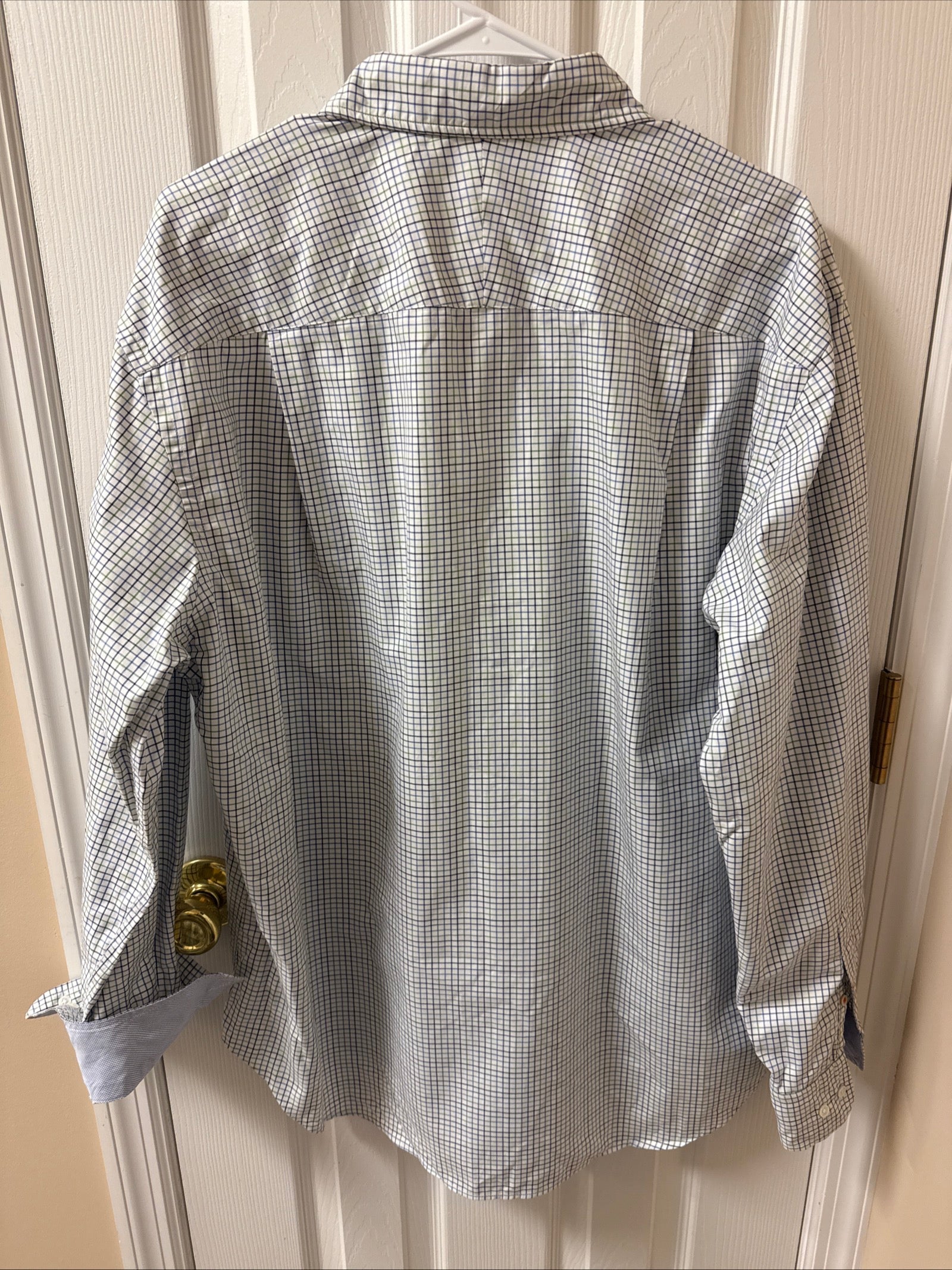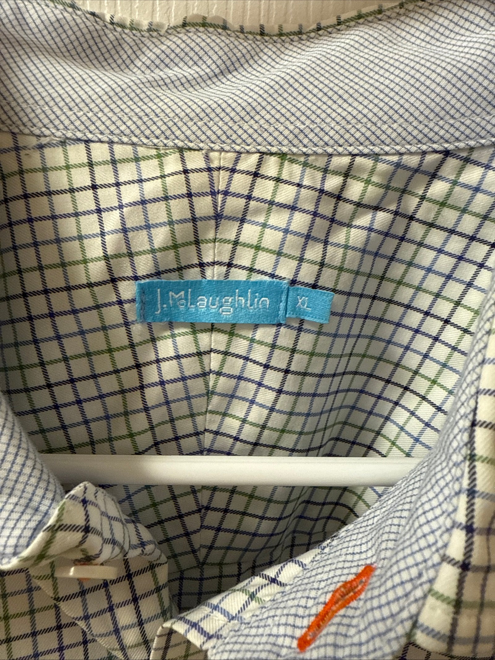 The J. McLaughlin Button Down Up Shirt in adult XL size is a stylish and versatile piece for men. Featuring a blue and purple plaid pattern, this shirt is perfect for a variety of occasions including casual, business, and even parties. Made from lightweight cotton fabric, this shirt is breathable and suitable for all seasons.