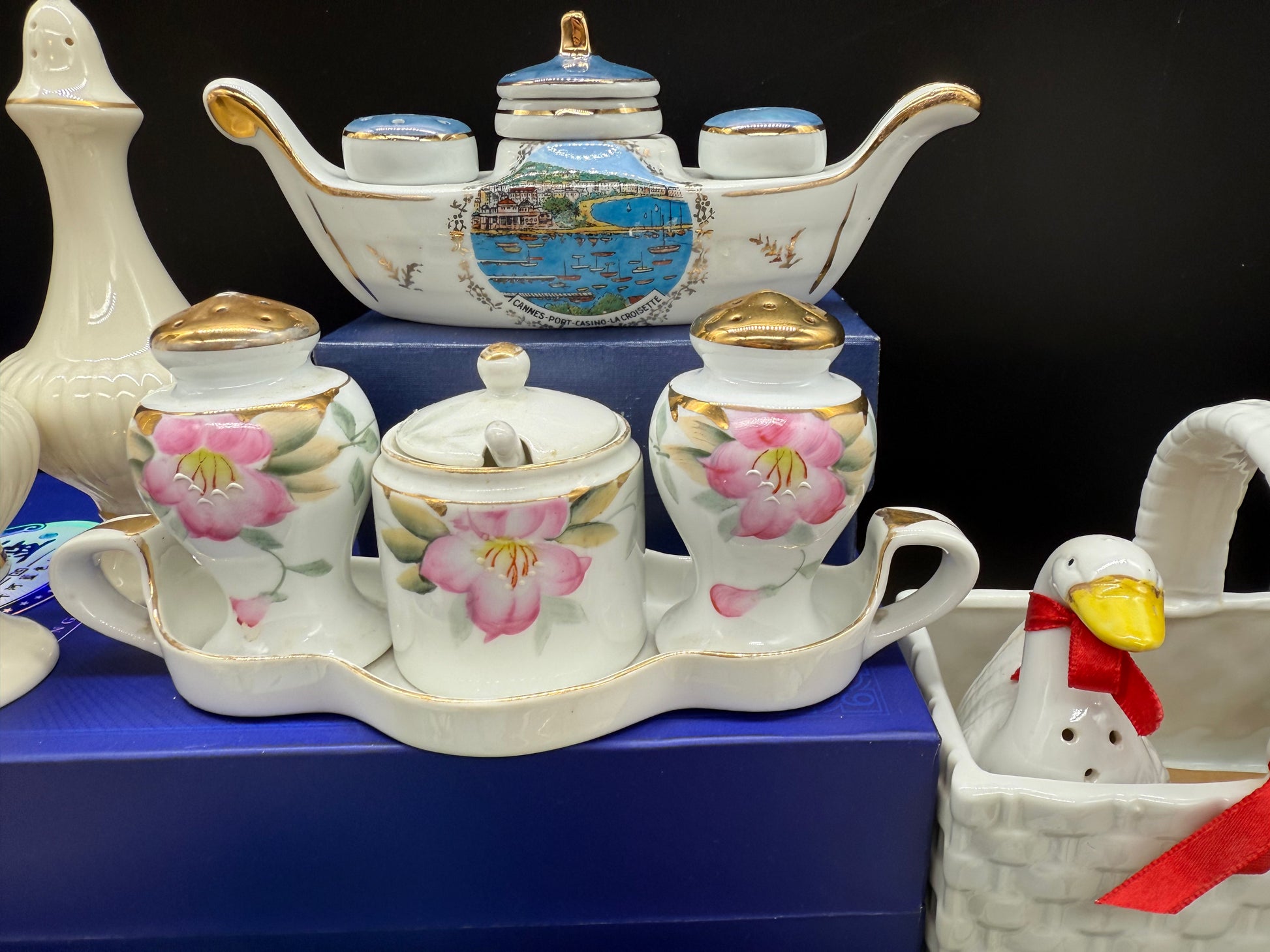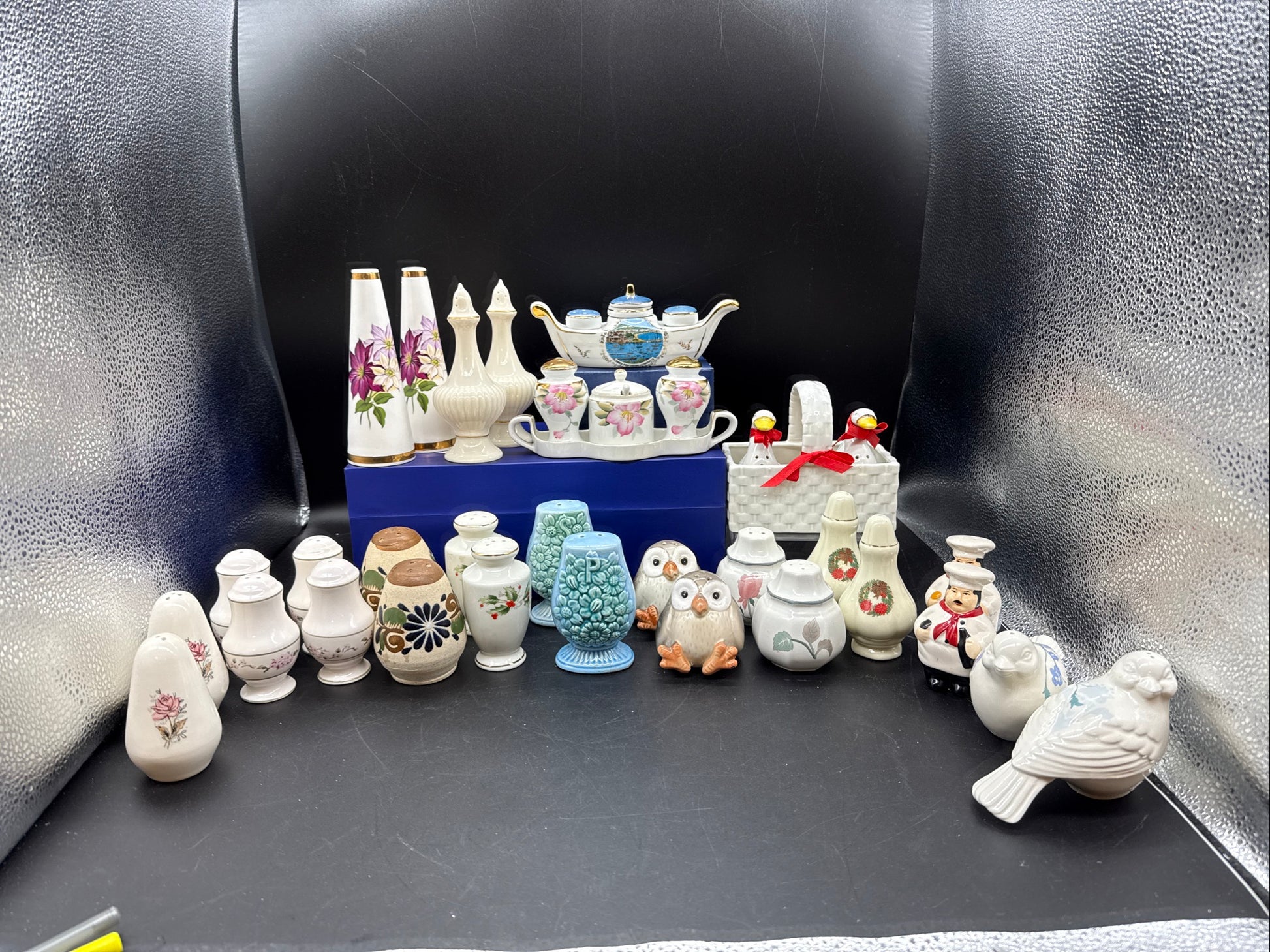 4-Japan (1-Noritake Azalea 6 piece set hand hand painted possibly 1920-1930’s has gold fading on top of shaker-see pic-stopper’s missing for both), 1 VTG Blue glaze daisy’s footed possibly 1960’s, VTG-Mikasa Silk Flowers, Fritz and Floyd owls)