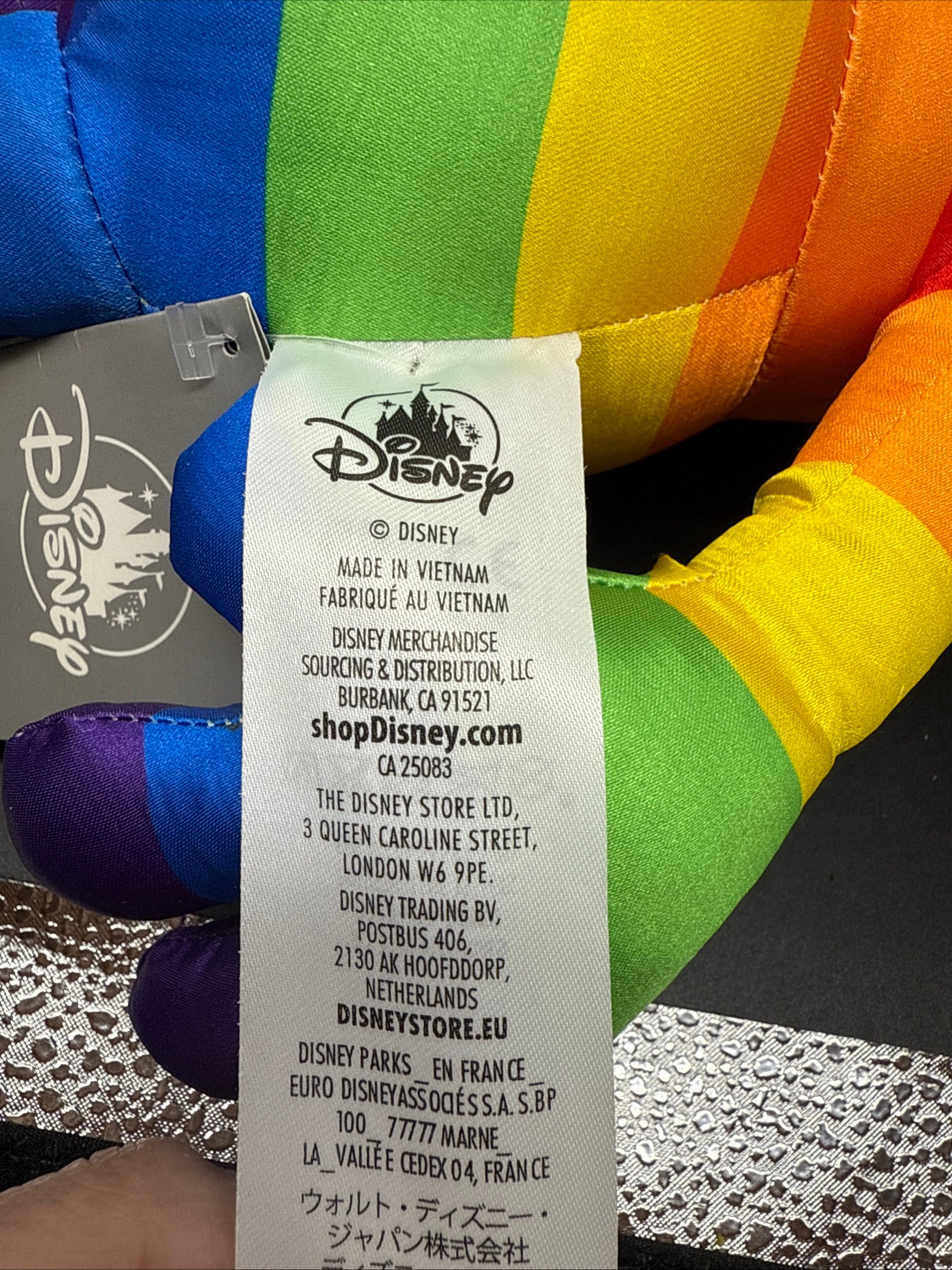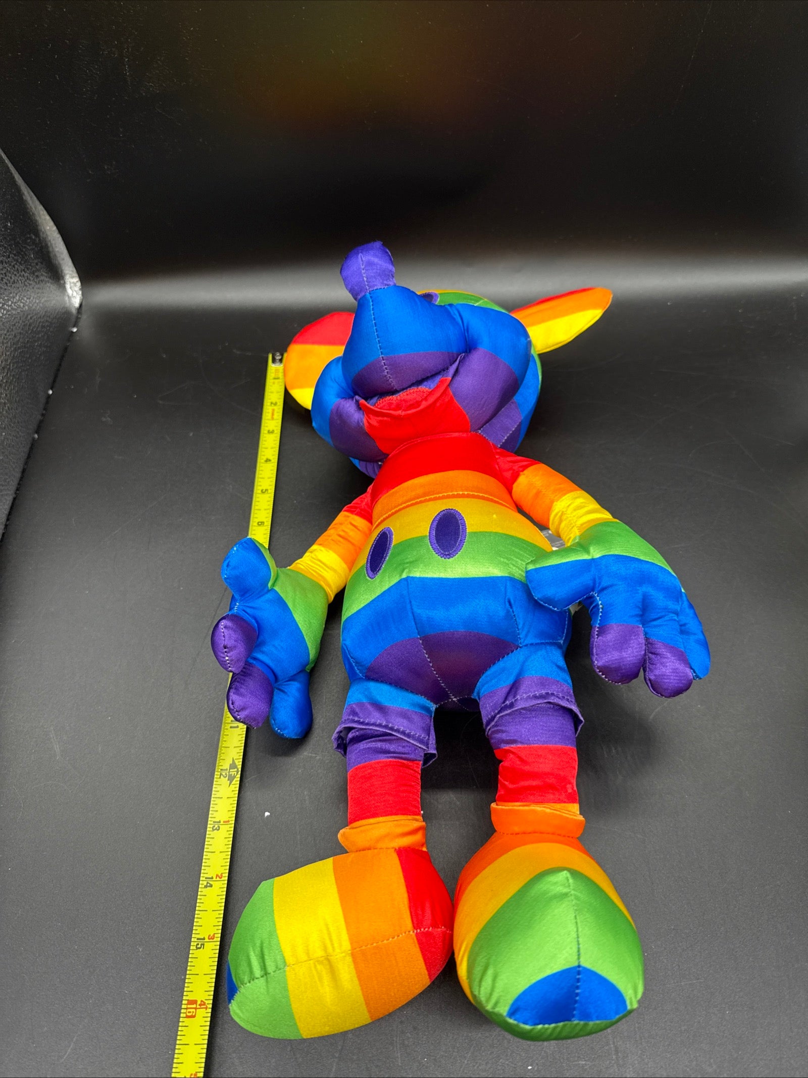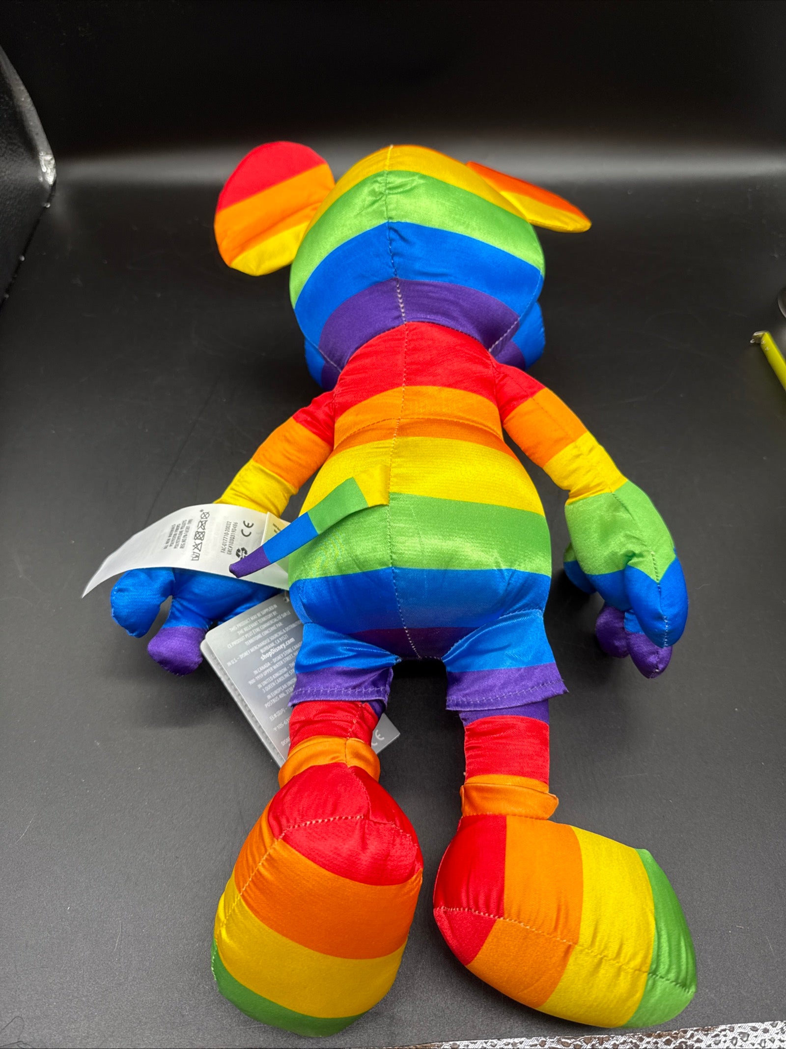 The product is a 15-inch plush Mickey Mouse toy made by Disney, featuring a rainbow design to celebrate LGBTQ+ pride. This special edition item from 2020 is part of the Disney franchise and has not been modified. With its colorful satin fabric and iconic character, this collectible is perfect for Disney fans and LGBTQ+ supporters alike.