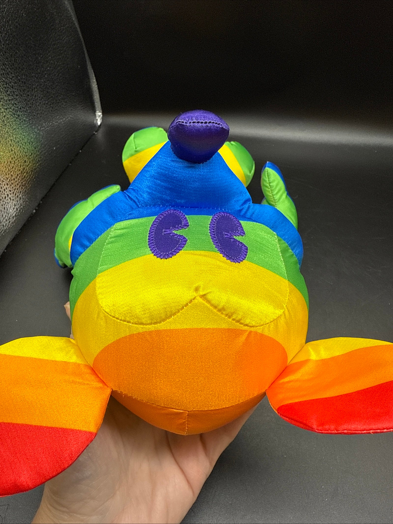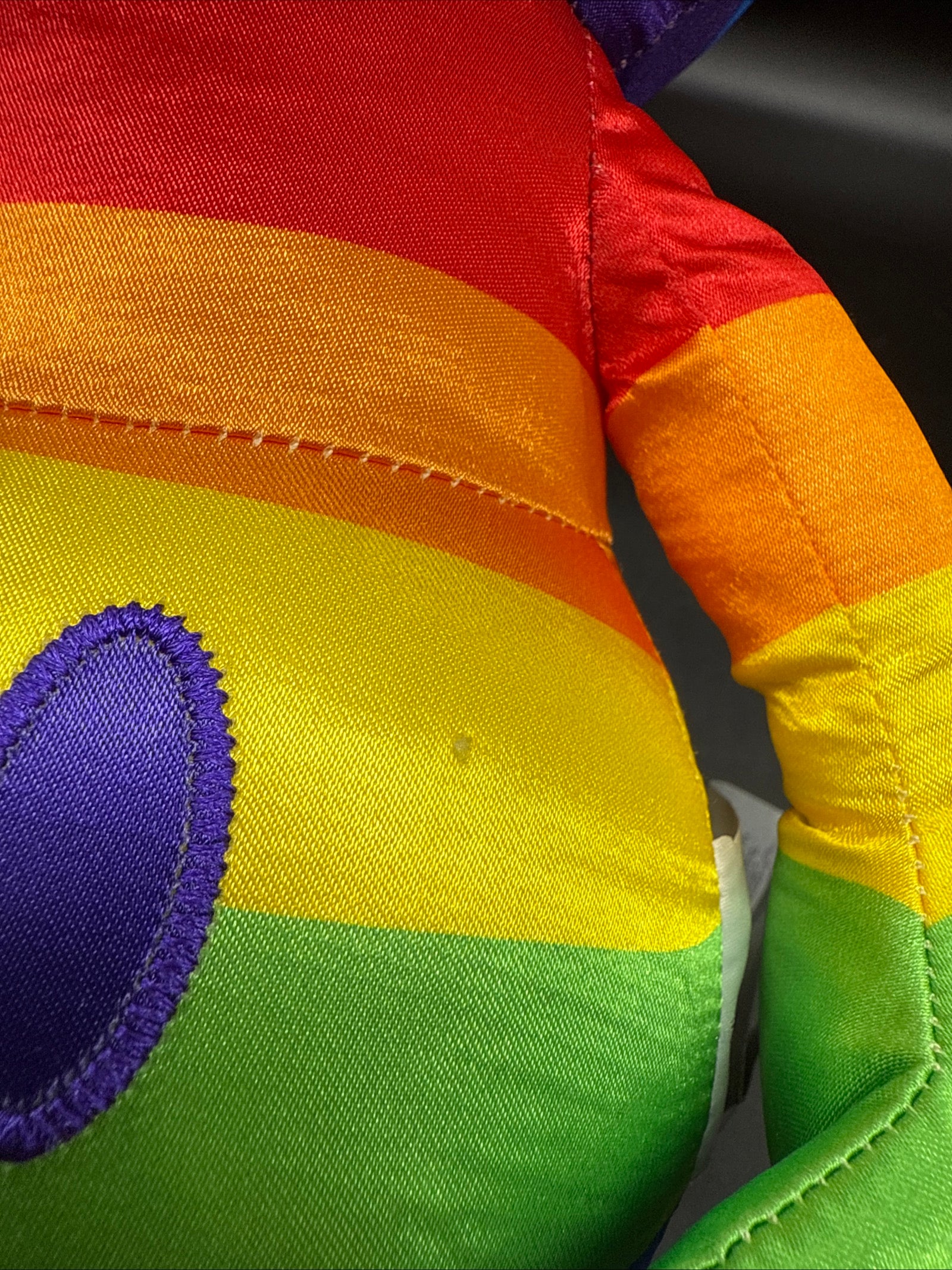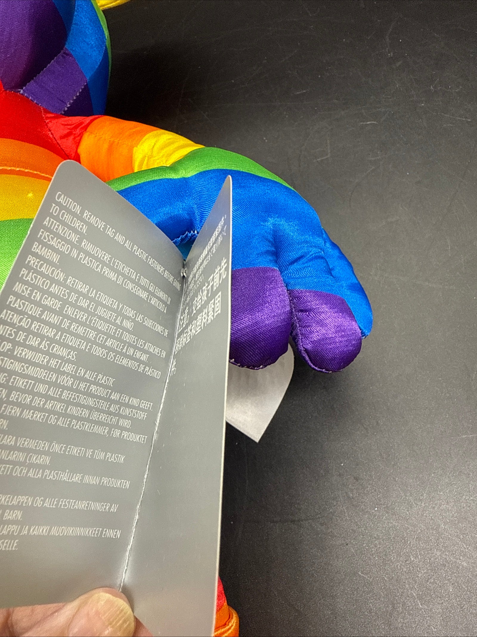 The product is a 15-inch plush Mickey Mouse toy made by Disney, featuring a rainbow design to celebrate LGBTQ+ pride. This special edition item from 2020 is part of the Disney franchise and has not been modified. With its colorful satin fabric and iconic character, this collectible is perfect for Disney fans and LGBTQ+ supporters alike.