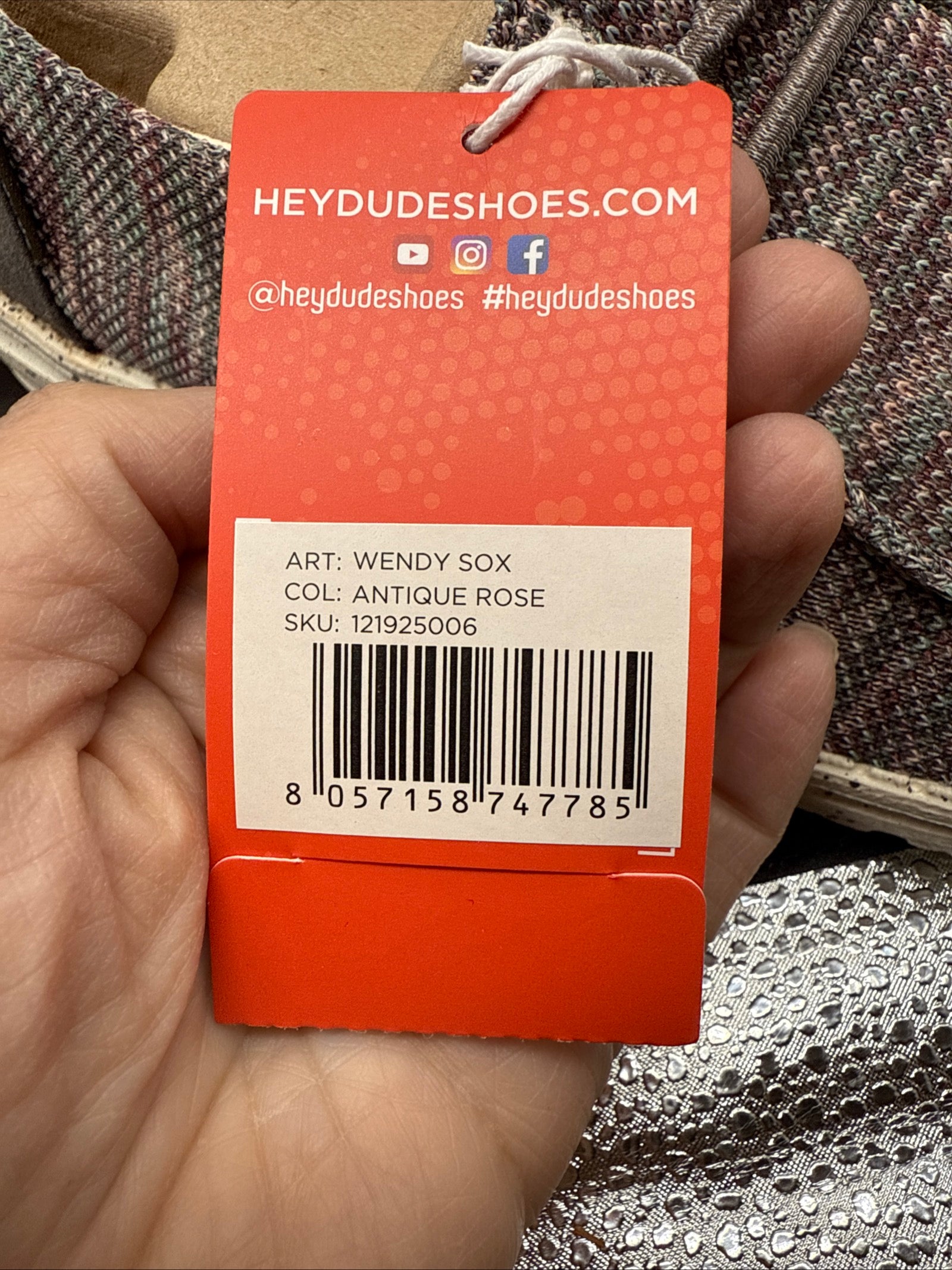 NIB-Hey Dude Wendy Sox Antique Rose Women's Size 10 Shoes are stylish slip-on casual shoes perfect for travel and everyday wear. Featuring a round toe shape and flat heel, these shoes offer comfort and breathability with a lightweight foam insole. The vintage-inspired Antique Rose pattern adds a colorful touch to the standard shoe width, making them a versatile and on-trend option for summer, fall, and spring seasons. Ideal for walking, beach outings, or school activities, these Hey Dude Wendy Sox are a must-have for any woman looking for a mix of style and functionality in her footwear collection.