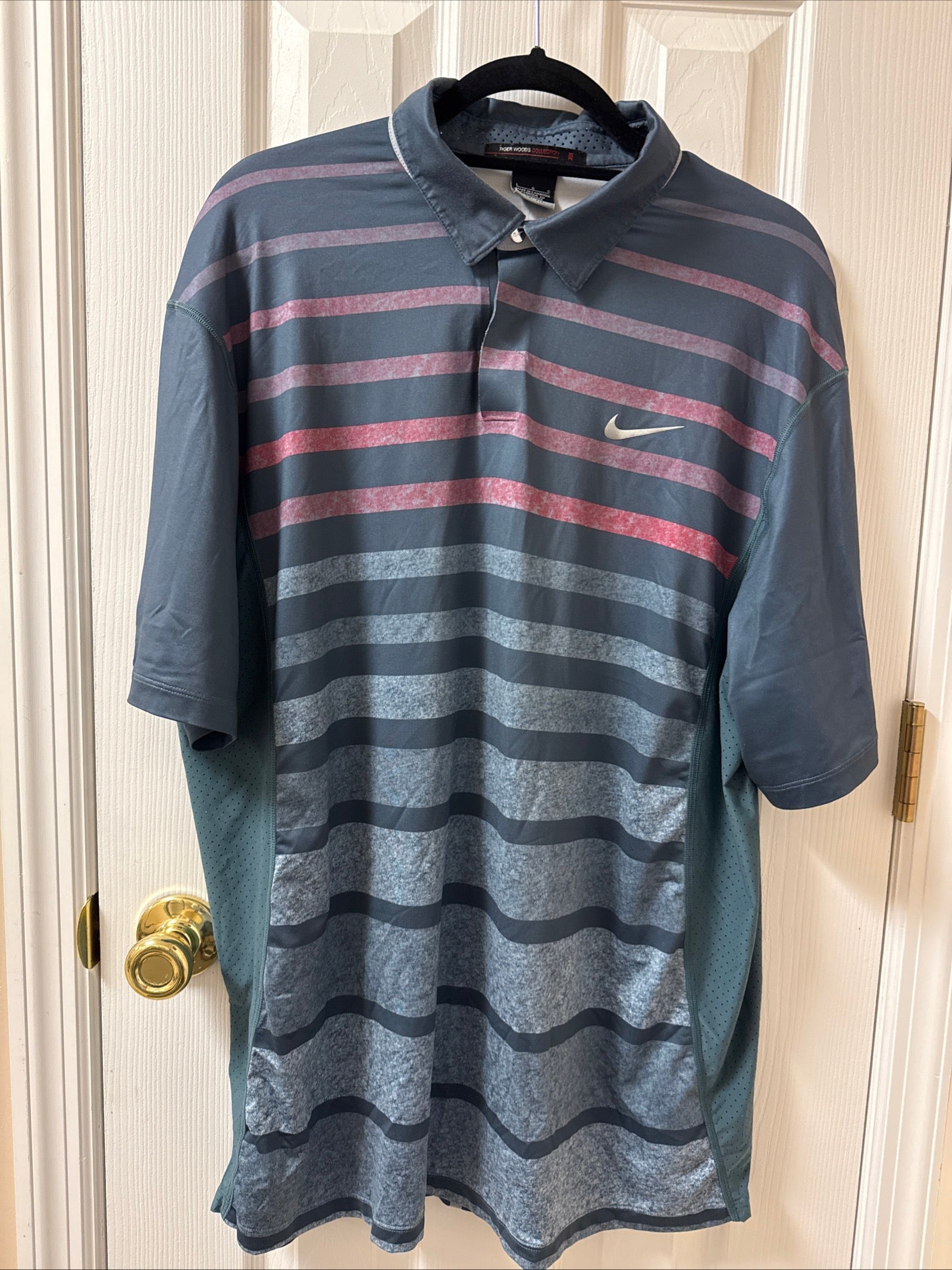 This Nike Tiger Woods Collection polo shirt is perfect for any active occasion, especially golf. The shirt features a striped pattern and an embroidered logo with the Nike Swoosh. It has short sleeves and a snap closure, making it easy to wear and remove.