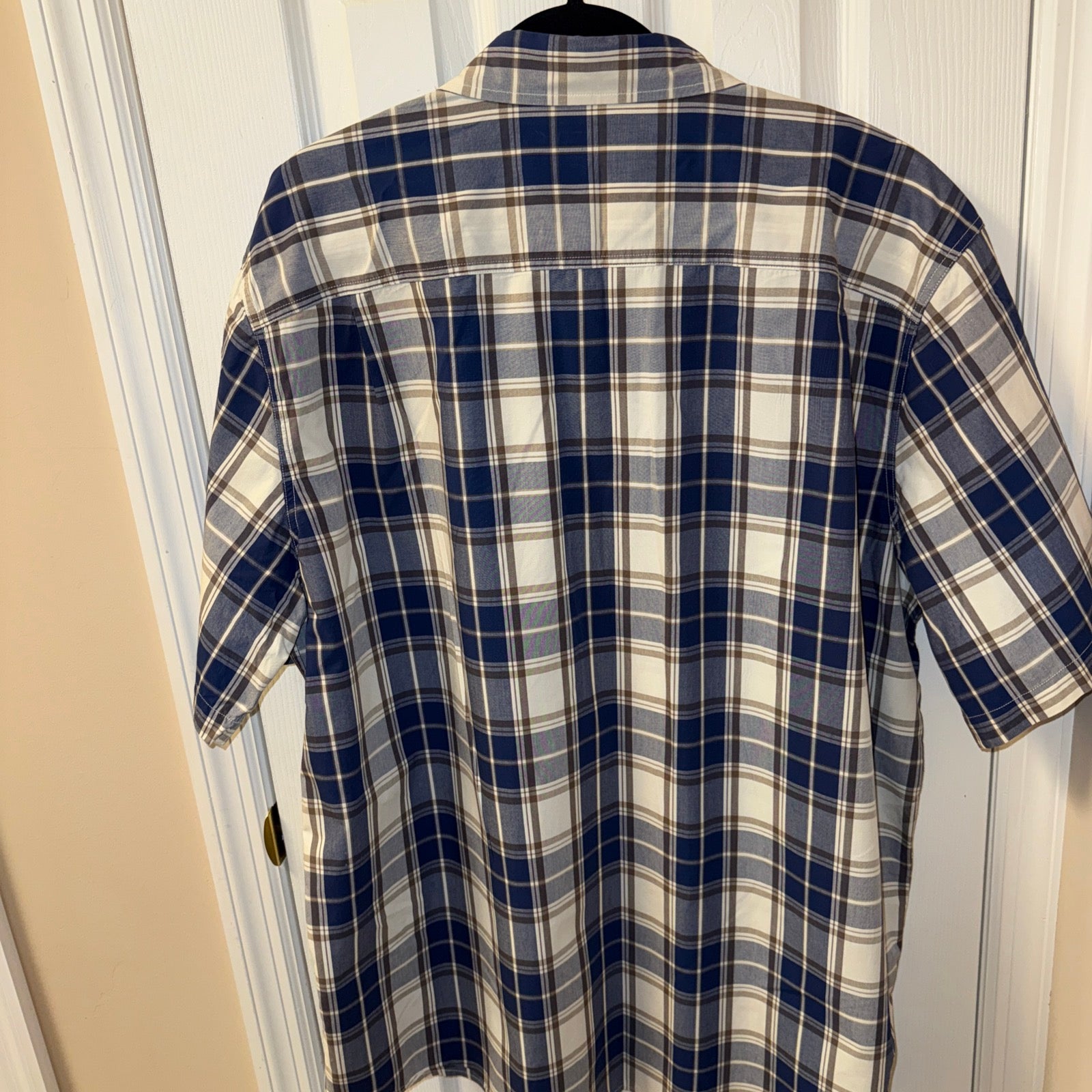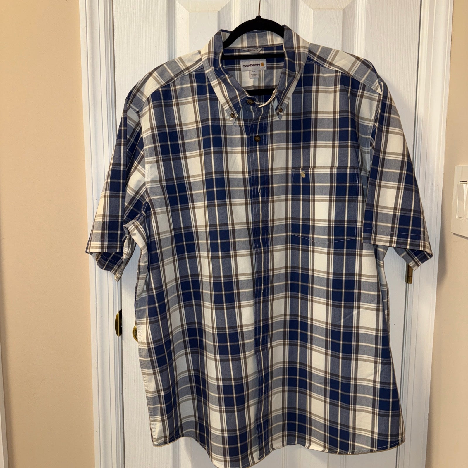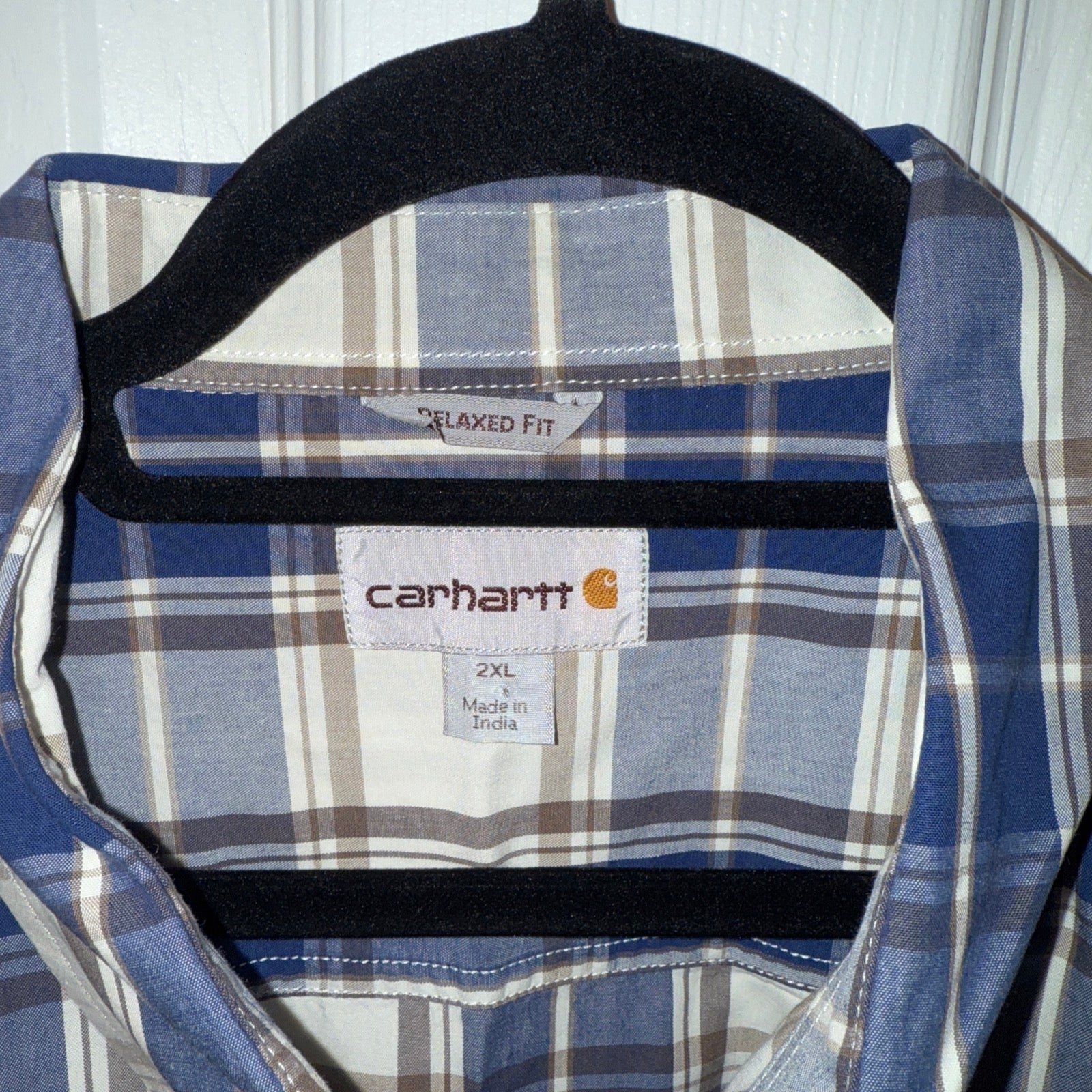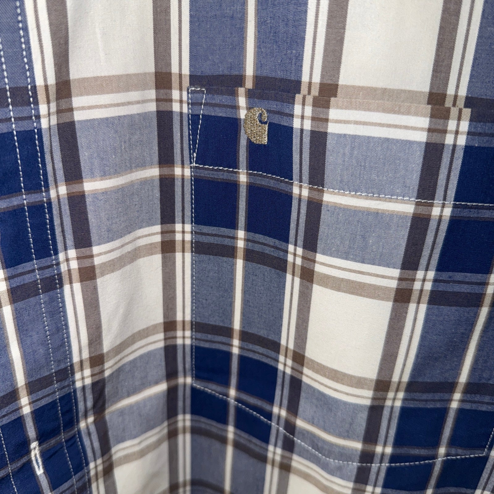 Vintage-Upgrade your casual or workwear wardrobe with this Carhartt button-down shirt. This blue plaid shirt comes in a relaxed fit with short sleeves and a button-down collar. It features a chest size of 52 inches and a 2XL size type, making it perfect for men of all sizes.