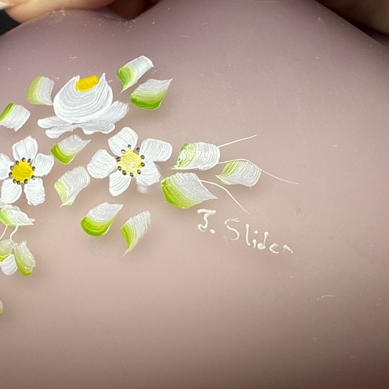 This vintage art glass rose bowl vase is a beautiful addition to any collection. The lavender pink color and floral pattern make it a perfect decorative piece for any room. The vase is hand painted and signed by the artist, J Slider adding to its unique charm.