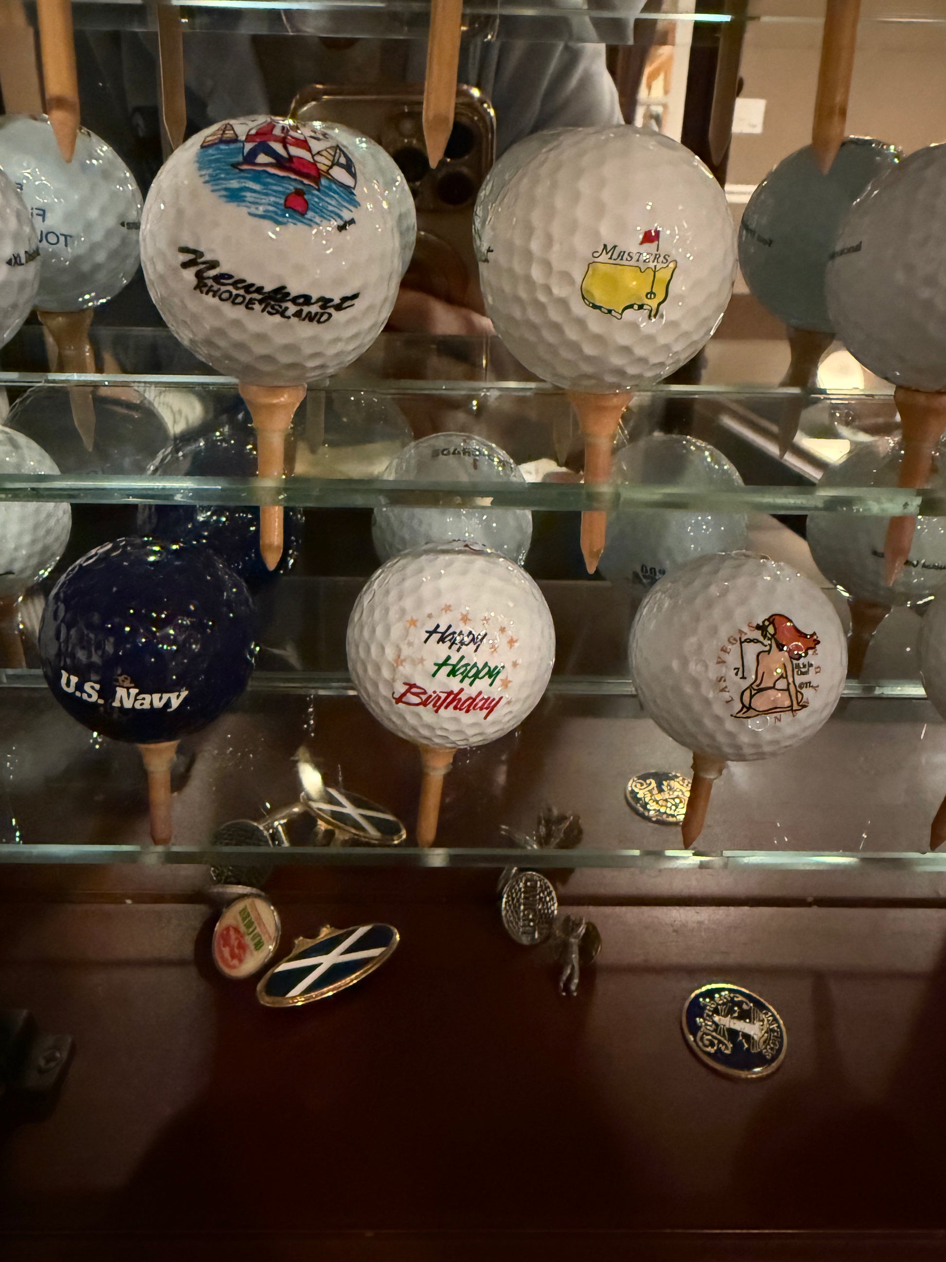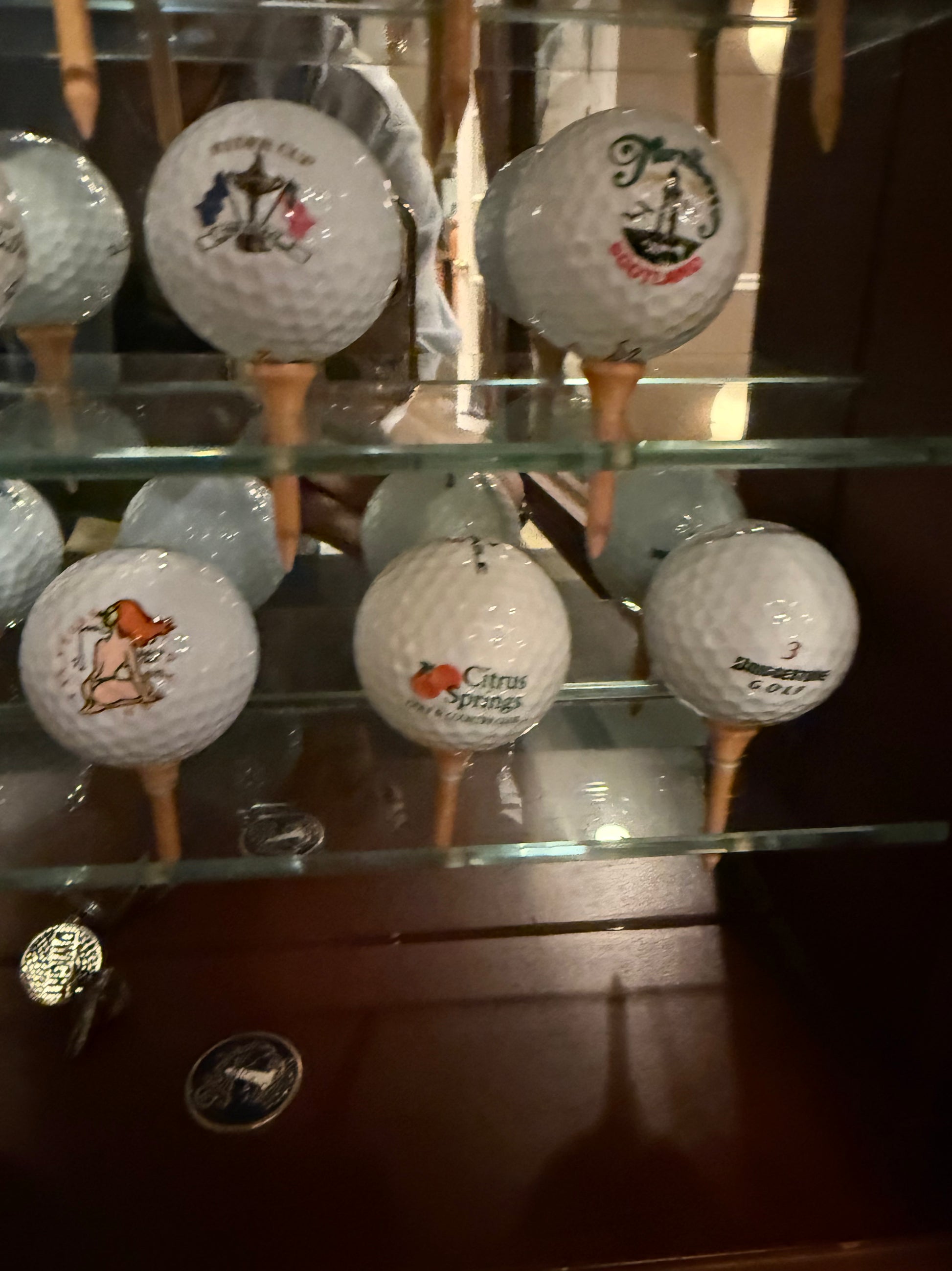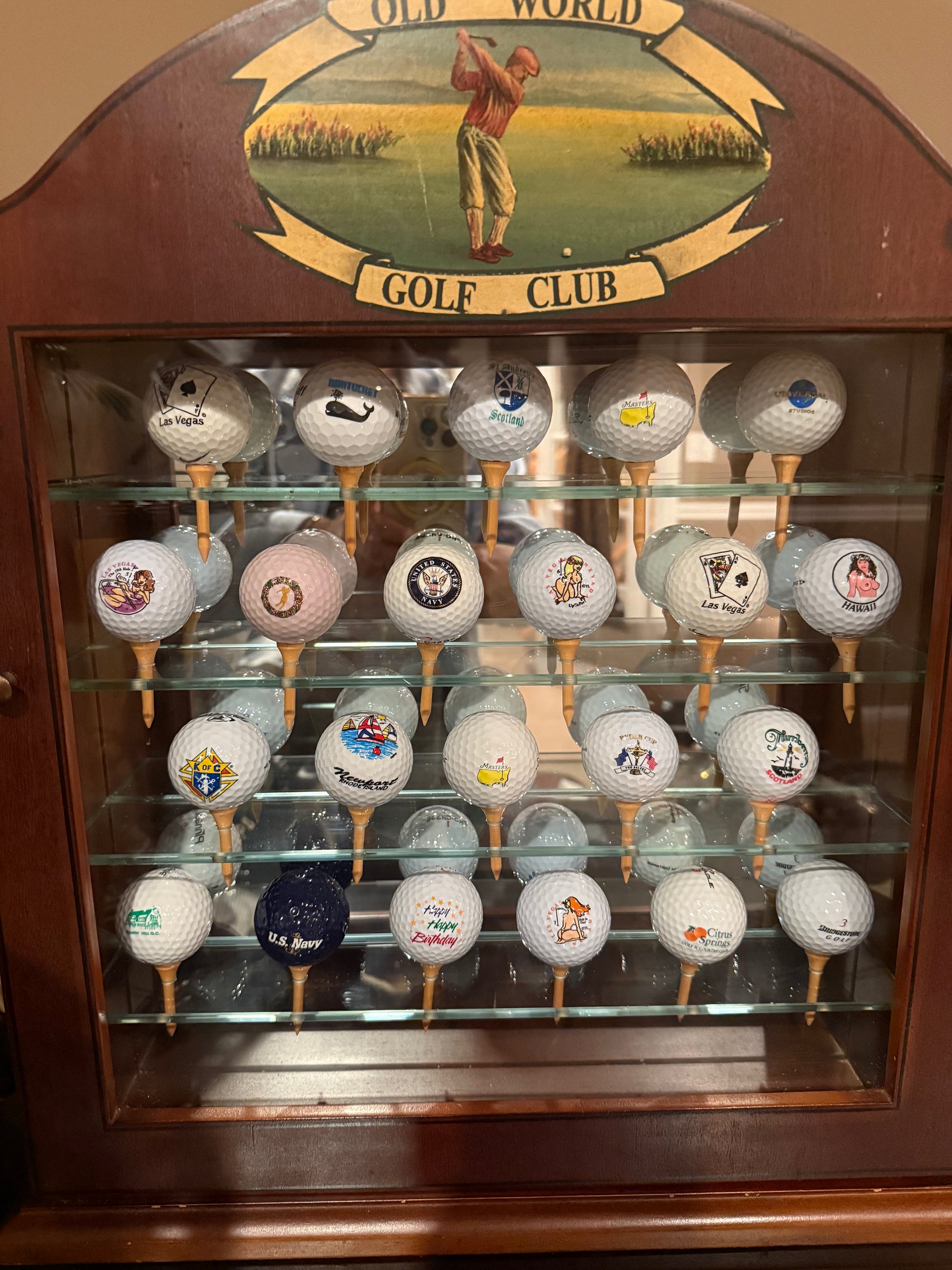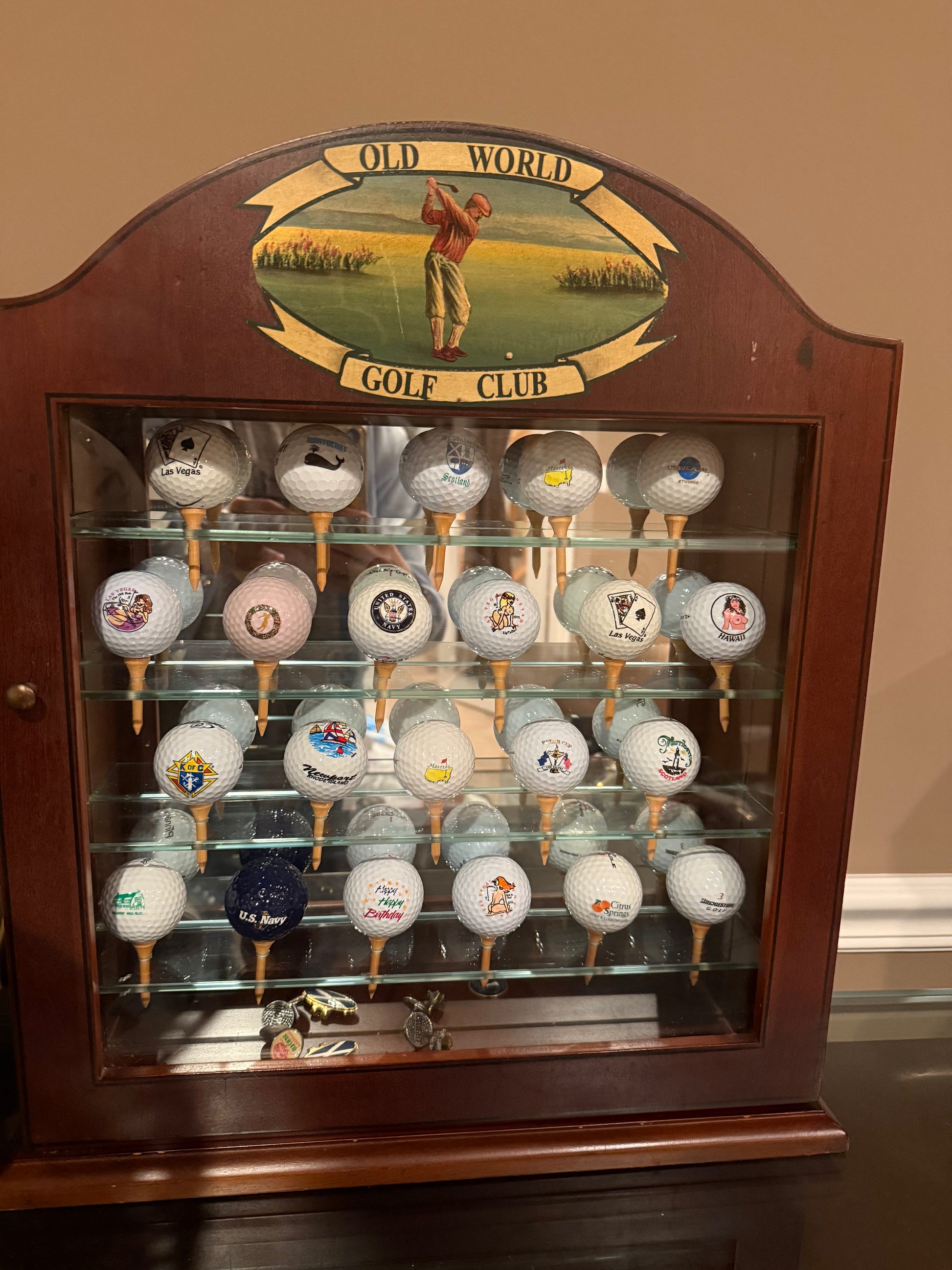 Wooden Old World Golf Club Display Case Cabinet With 22 Open Golf Balls And Pins